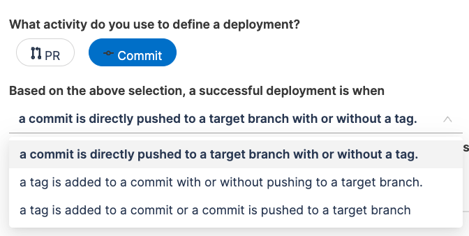 When the integration is configured with GitLab SCM, specify whether deployments causing failure and total deployments are defined based on Pull Requests (PR) or Commits.