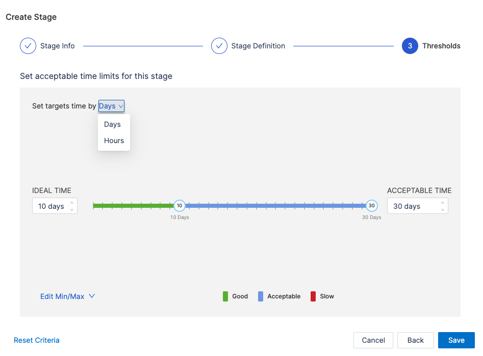 - Set acceptable time ranges for the stage, such as Ideal Time and Acceptable Time.