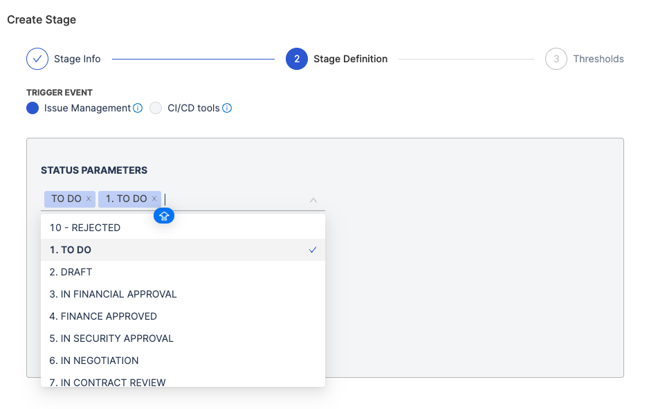 - Define the Stage Trigger Event (e.g., Issue Management) and map the stage to statuses in your issue management system.