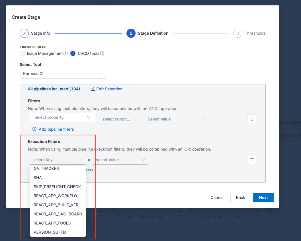 - Refine the calculation by specifying detailed filters. This filters pipelines that should contribute to the change failure rate calculations.