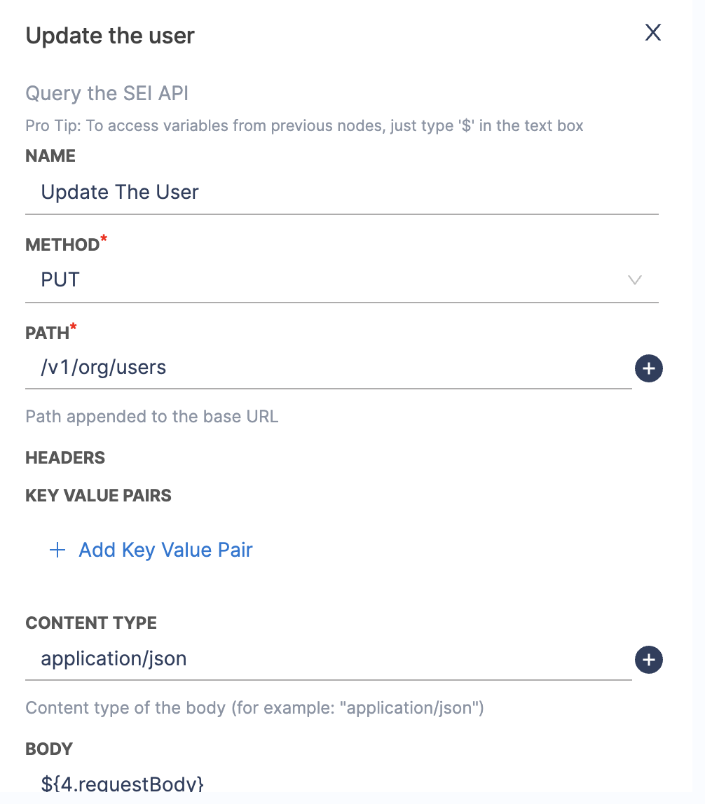 - Use a SEI Query node to make API calls to SEI for updating contributor information.